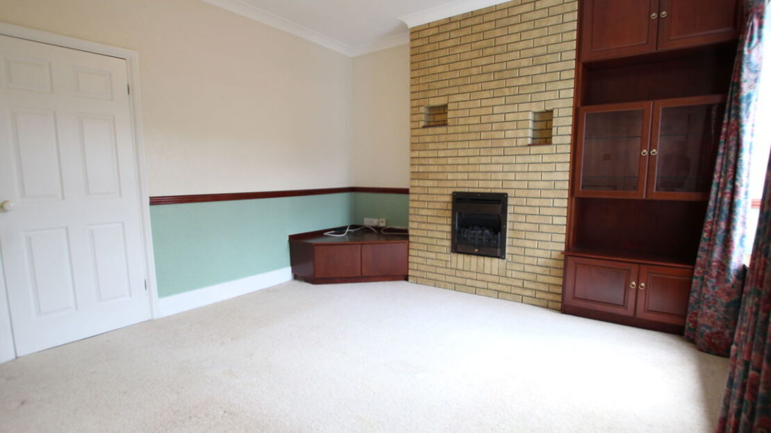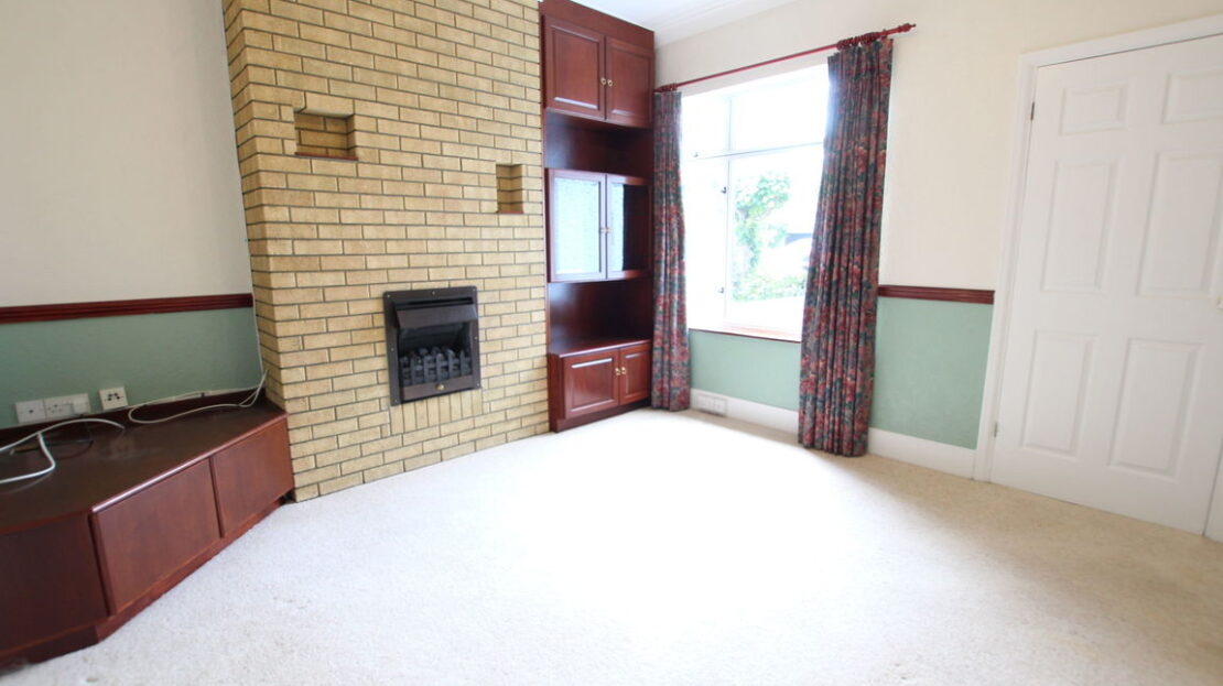 uPVC double glazed window to front elevation, single panel radiator, ornamental chimney breast with decommissioned gas fire, fitted T.V plinth and display unit, coving to ceiling, door to: