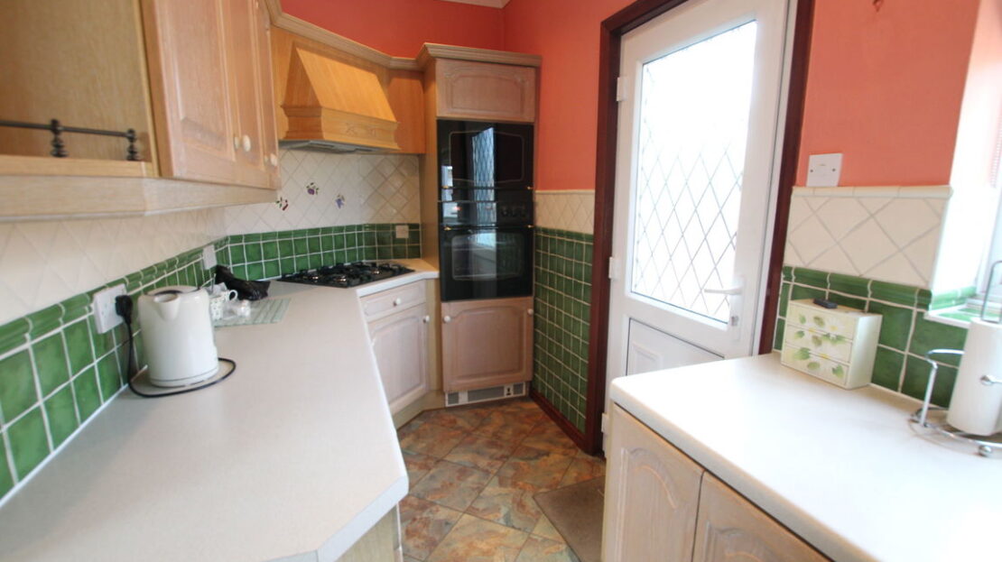 uPVC double glazed window and door to side elevation, fitted kitchen comprising of single drainer corner sink unit with mixer tap over, roll top work surfaces, range of base units incorporating built-in ‘Stoves’ gas hob and matching electric oven with microwave space door over, built-in Neff dish washer, built-in Neff washing machine, built-in fridge, tiling to splash areas, matching range of wall mounted units incorporating corner extractor hood.