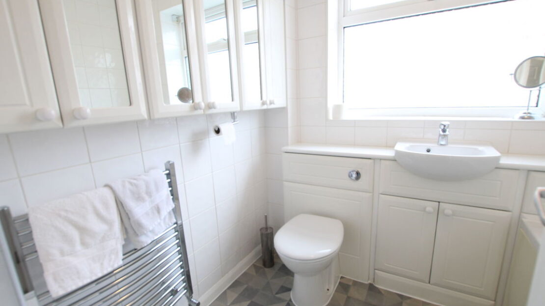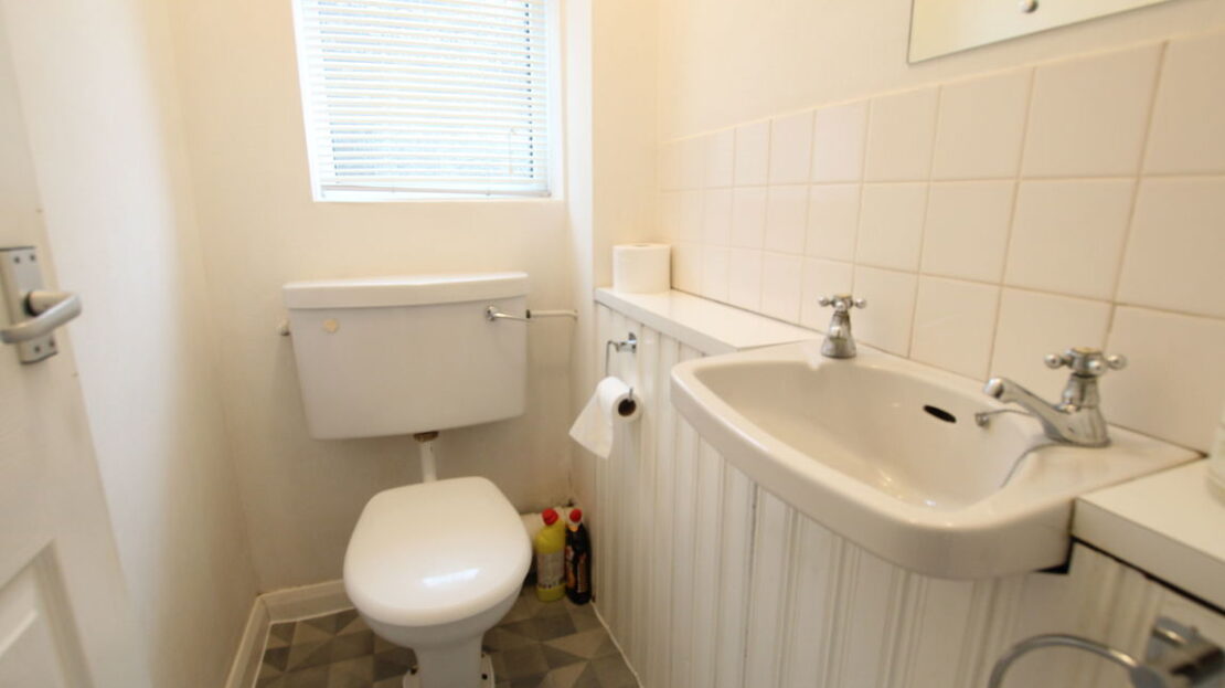 uPVC obscure double glazed window to side elevation, two piece suite comprising of low level W.C, wash hand basin, tiling to splash areas.