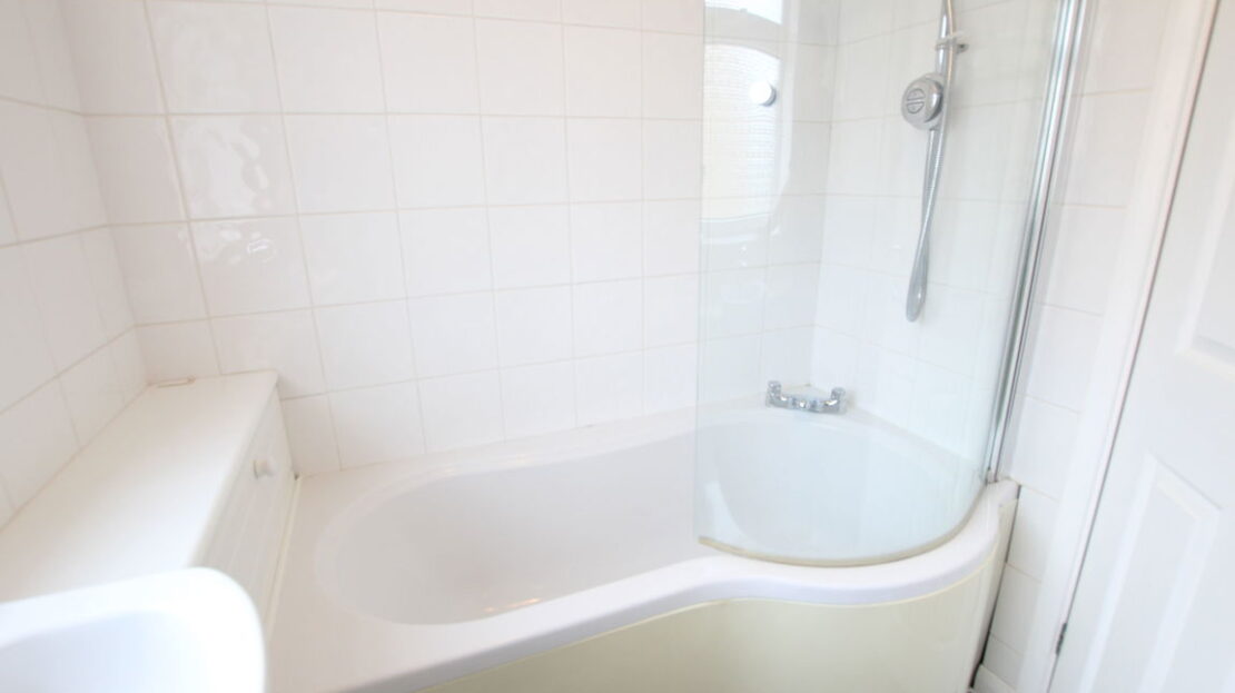 uPVC obscure double glazed window to side elevation, chrome vertical towel rail/radiator, three piece suite comprising of low level W.C with wash hand basin set into a vanity unit, ‘P’ shaped panel bath with mixer tap over and separate shower control over, tiling to all elevations.