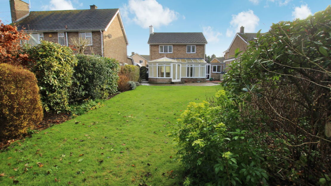 A generous and well screened mature rear garden reaching in excess of 100ft in length, mainly laid to lawn, extensive paved patio, two timber garden store/sheds at rear, side area with oil tank and gate to front.